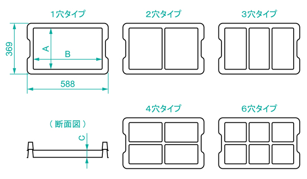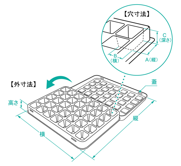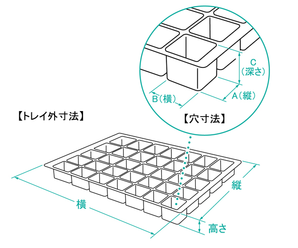 型番号 穴寸法 穴数( 縦 × 横 ) トレイ高さ コンテナに入る枚数 図面