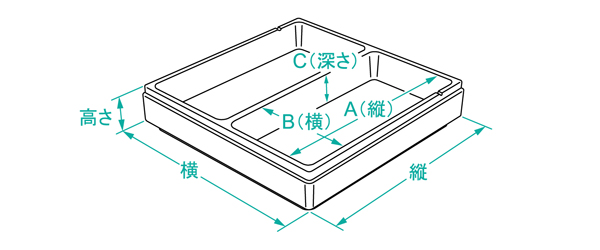 A(縦)× B(横) C(深さ) 高さ 蓋を開けた状態