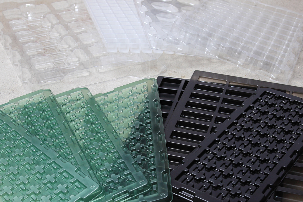 プラスチック素材でできた部品トレイは、商品の梱包材としてだけでなく、緩衝材、運搬資材としても幅広く活躍しています。金型代がいらない規格トレイは約200種類。そのほか、オリジナルのオーダーや、セミオーダーも可能。完全社内生産なので、高品質、低価格、短納期で提案します。